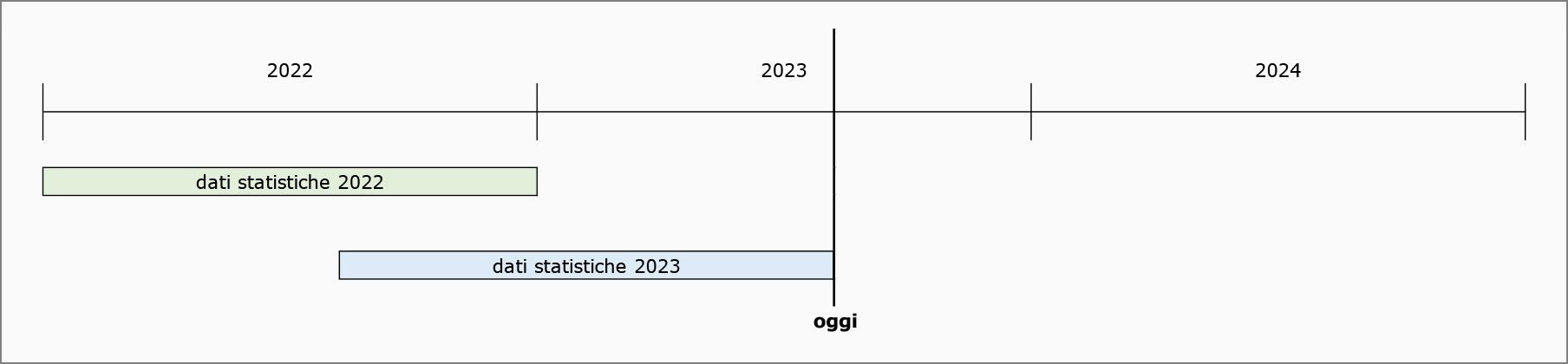 Per questo motivo se, ad esempio siamo nel 2023 ed è il 15 gennaio, il grafico del 2023 sarà quasi identico al grafico del 2022, in quanto è generato considerando il periodo dal 16/01/2022 al 15/01/2023 (mentre il grafico del 2022 copre dal 01/01/2022 al 31/12/2022, quindi più o meno gli stessi giorni).