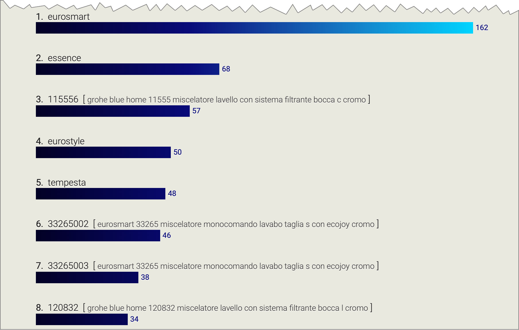 Questo è l’elenco dei parole chiave (può essere una linea / serie, un nome o tipologia prodotto, un codice articolo) in ordine decrescente di “interesse”. Nel caso la voce sia un codice prodotto accanto viene mostrata la descrizione corrispondente.