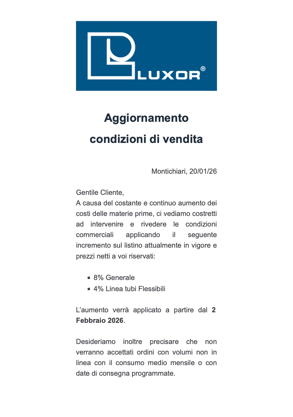 Luxor verranno accettati ordini con volumi non in linea con il consumo medio mensile o con date di consegna programmate.