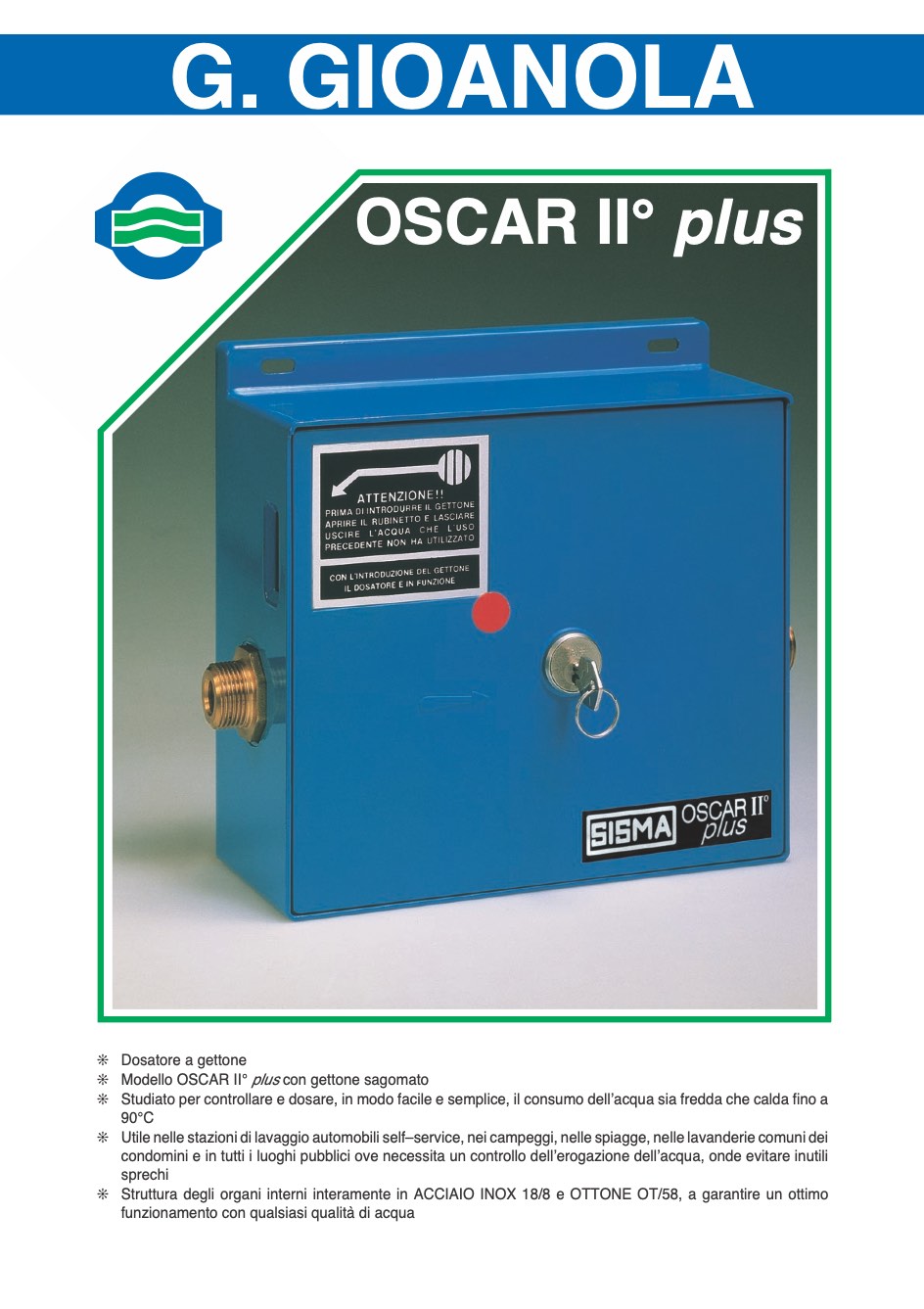Gioanola è un apparecchio che serve a dosare l'erogazione di acqua potabile calda e fredda mediante l'introduzione di un apposito gettone «oscar ii° plus». il funzionamento è meccanico, senza alcuna necessit à di collega-