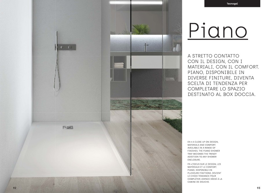 Disenia a stretto contatto con il design, con i materiali, con il comfort. piano, disponibile in diverse finiture, diventa scelta di tendenza per completare lo spazio destinato al box doccia.