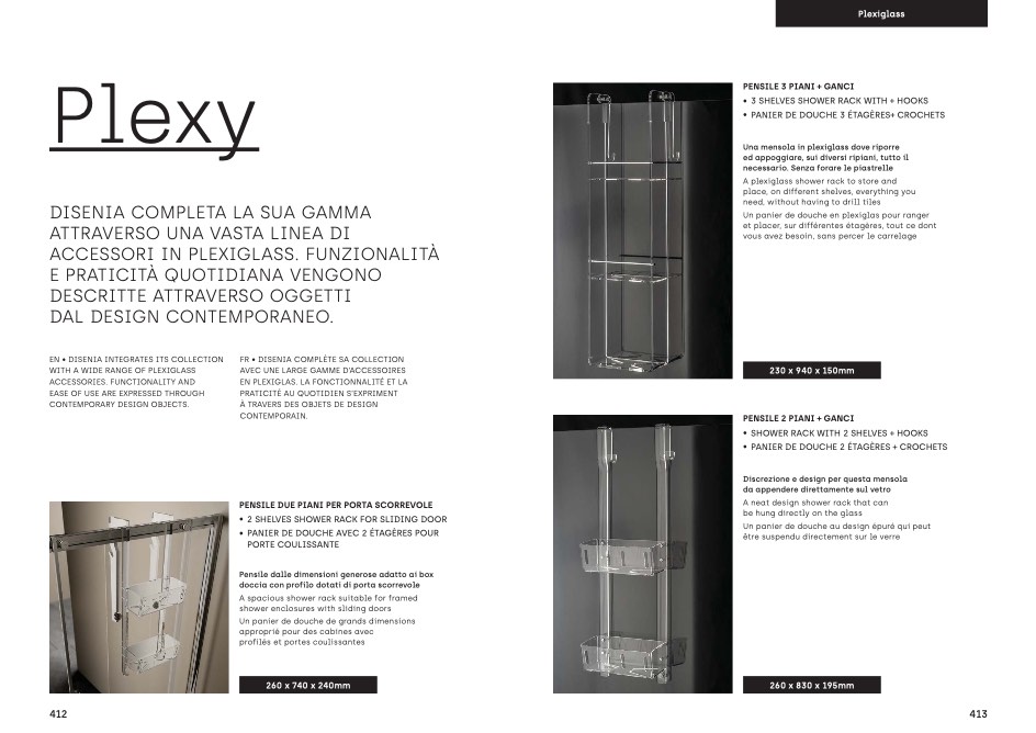 Disenia disenia completa la sua gamma attraverso una vasta linea di accessori in plexiglass. funzionalità e praticità quotidiana vengono descritte attraverso oggetti dal design contemporaneo.