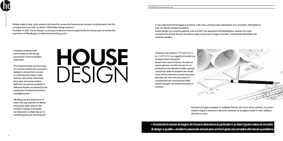 HD House Design e’ una realtà fortemente legata al territorio e alla storia, orientata alla realizzazione di un prodotto 100% made in italy con elevati standard qualitativi. house design è un marchio giovane, nato nel 2007 che appartiene alla metalbagno, azienda che vanta un’esperienza di oltre 40 anni nel settore degli accessori per il bagno di qualità, caratterizzati dall’utilizzo dei materiali metallici. collezioni che esaltano