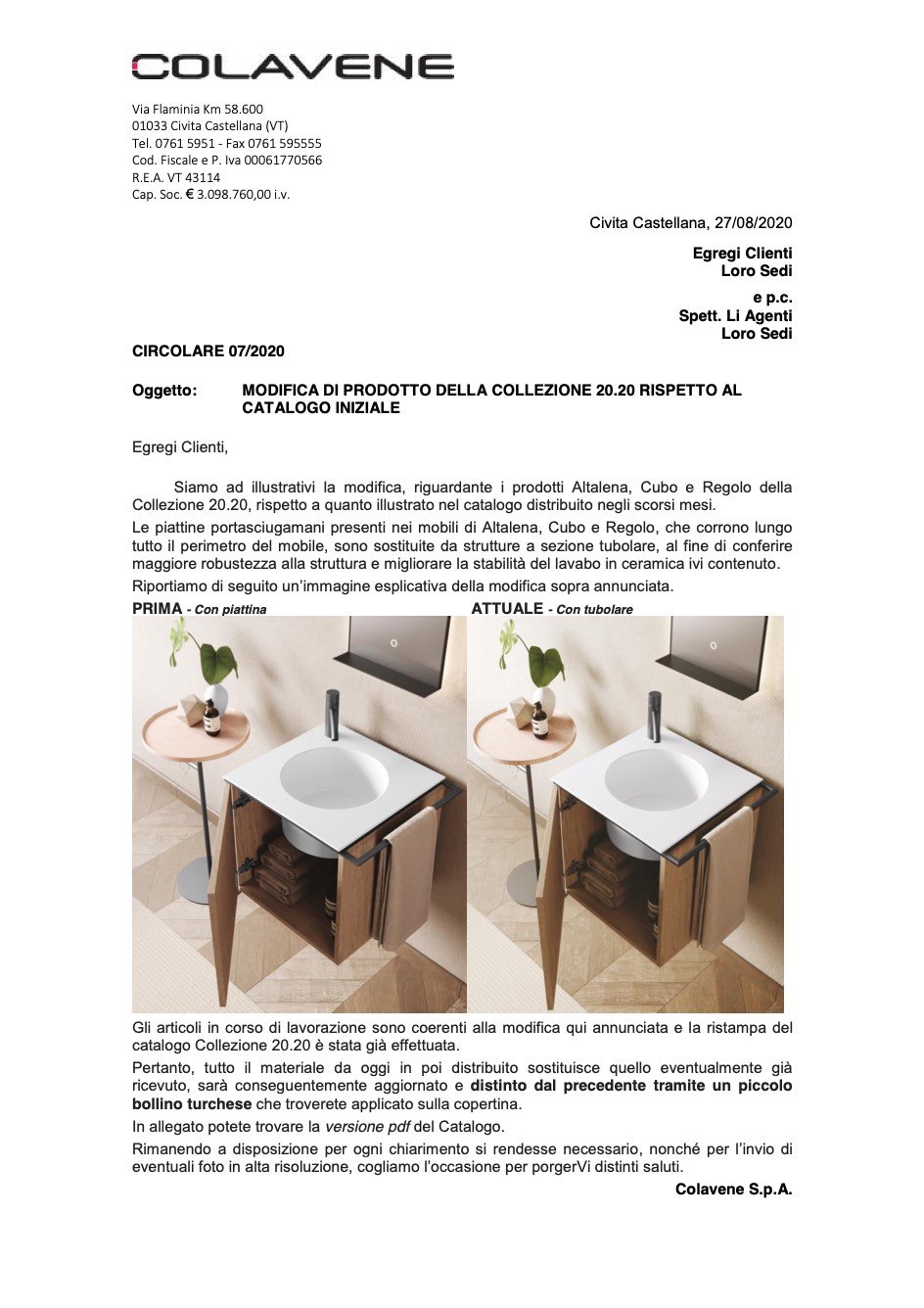 Colavene gli articoli in corso di lavorazione sono coerenti alla modifica qui annunciata e la ristampa del catalogo collezione 20.20 è stata già effettuata. pertanto, tutto il materiale da oggi in poi distribuito sostituisce quello eventualmente già ricevuto, sarà conseguentemente aggiornato e distinto dal precedente tramite un piccolo bollino turchese che troverete applicato sulla copertina. in allegato potete trovare la versione pdf del catalogo. rimanendo a disposizione per ogni chiarimento si rendesse necessario, nonché per l’invio di eventuali foto in alta risoluzione, cogliamo l’occasione per porgervi distinti saluti.