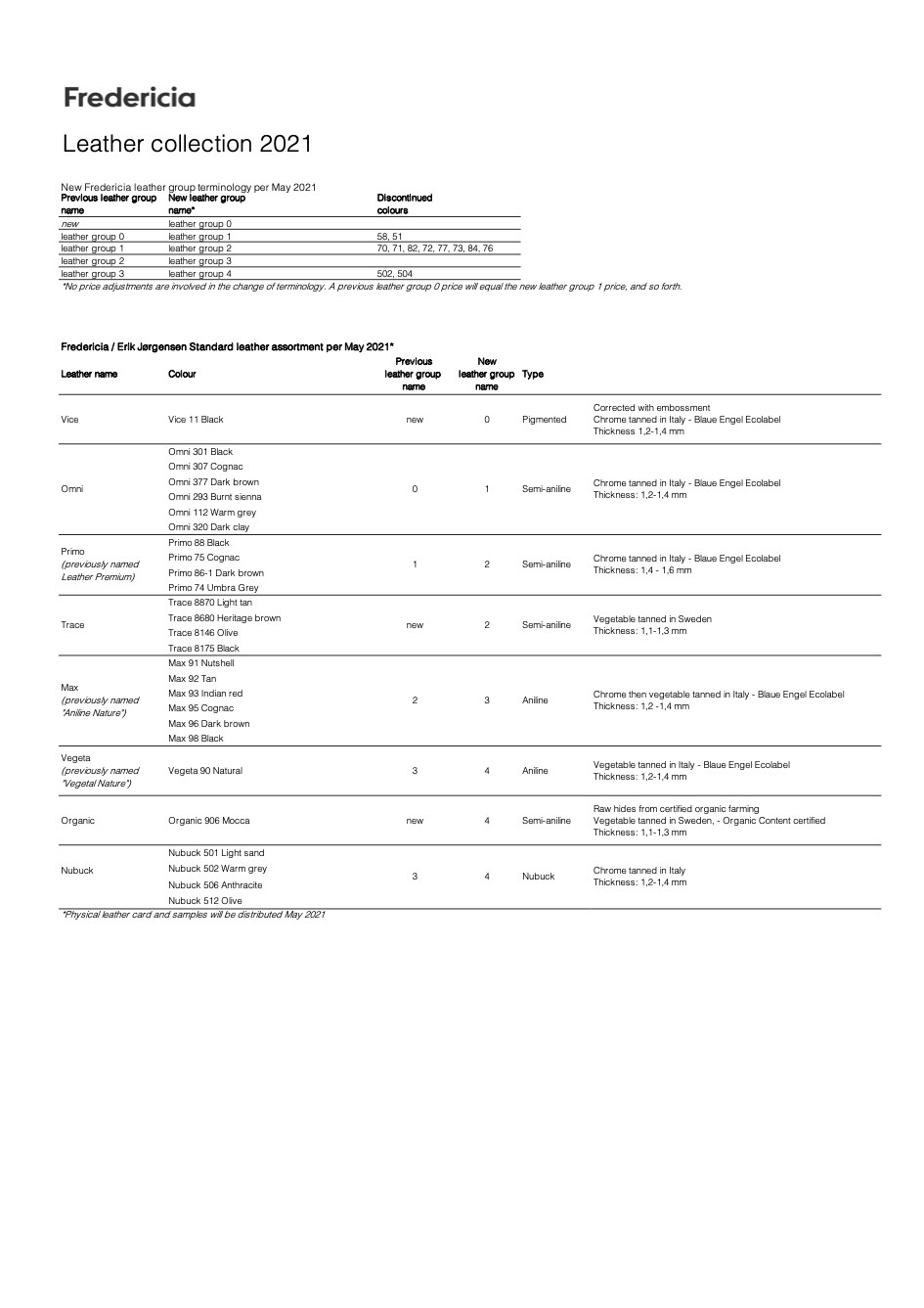 Fredericia vice omni primo (previously named leather premium) trace max (previously named "aniline nature") vegeta (previously named "vegetal nature") organic nubuck