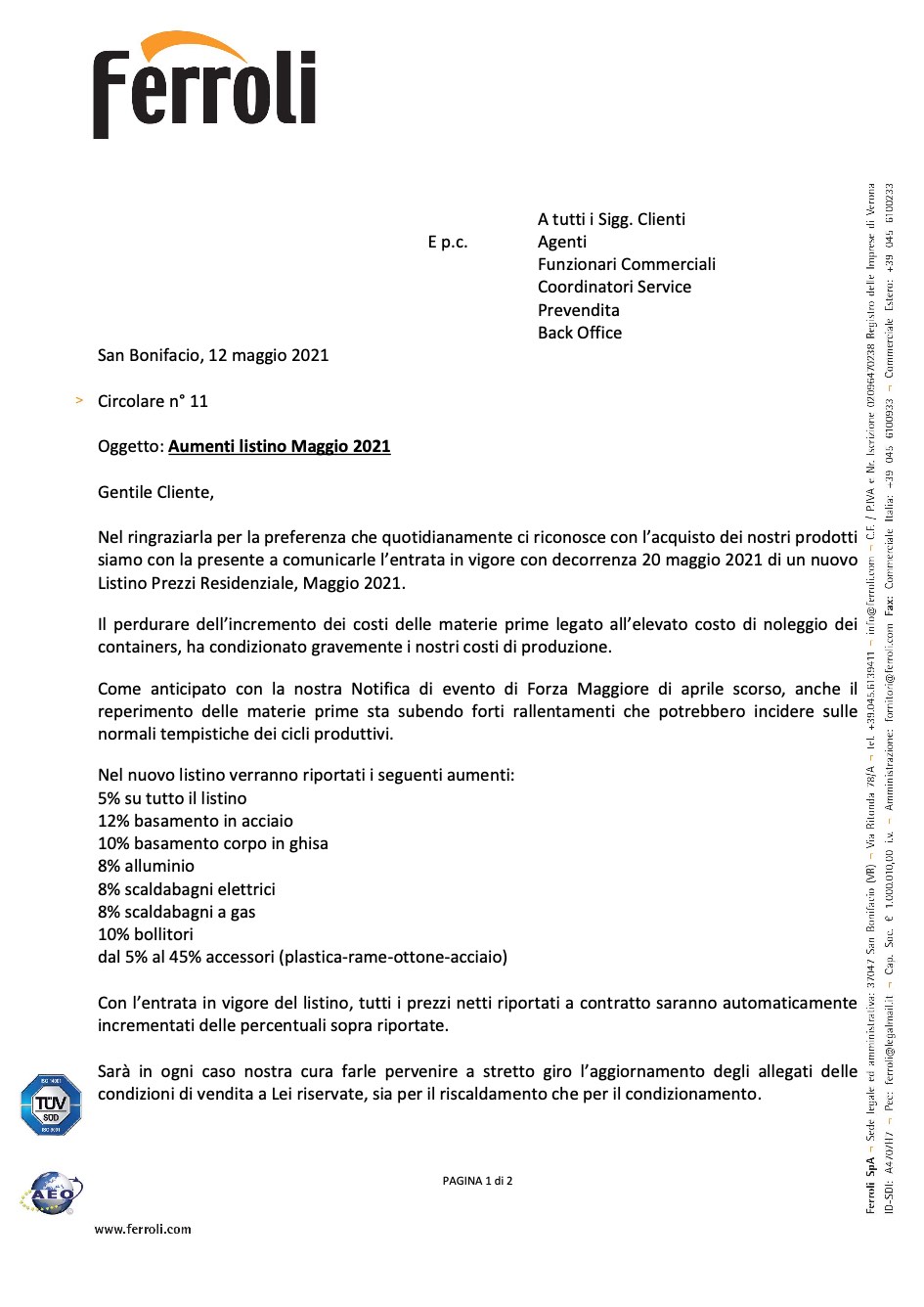 Ferroli san bonifacio, 12 maggio 2021 circolare n° 11 oggetto: aumenti listino maggio 2021 gentile cliente, nel ringraziarla per la preferenza che quotidianamente ci riconosce con l’acquisto dei nostri prodotti siamo con la presente a comunicarle l’entrata in vigore con decorrenza 20 maggio 2021 di un nuovo listino prezzi residenziale, maggio 2021. il perdurare dell’incremento dei costi delle materie prime legato all’elevato costo di noleggio dei containers, ha condizionato gravemente i nostri costi di produzione. come anticipato con la nostra notifica di evento di forza maggiore di aprile scorso, anche il reperimento delle materie prime sta subendo forti rallentamenti che potrebbero incidere sulle normali tempistiche dei cicli produttivi. nel nuovo listino verranno riportati i seguenti aumenti: 5% su tutto il listino 12% basamento in acciaio 10% basamento corpo in ghisa 8% alluminio 8% scaldabagni elettrici 8% scaldabagni a gas 10% bollitori dal 5% al 45% accessori (plastica-rame-ottone-acciaio) con l’entrata in vigore del listino, tutti i prezzi netti riportati a contratto saranno automaticamente incrementati delle percentuali sopra riportate. sarà in ogni caso nostra cura farle pervenire a stretto giro l’aggiornamento degli allegati delle condizioni di vendita a lei riservate, sia per il riscaldamento che per il condizionamento.