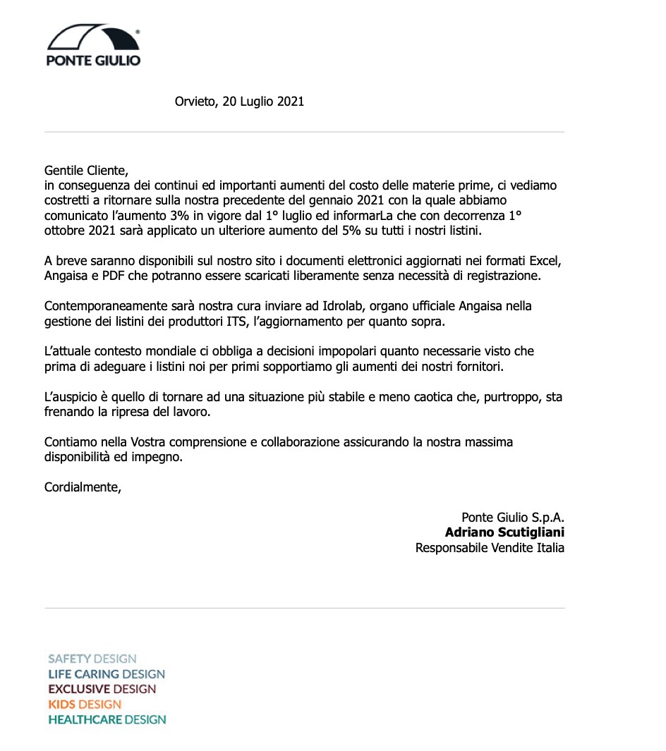 Ponte Giulio gentile cliente, in conseguenza dei continui ed importanti aumenti del costo delle materie prime, ci vediamo costretti a ritornare sulla nostra precedente del gennaio 2021 con la quale abbiamo comunicato l’aumento 3% in vigore dal 1° luglio ed informarla che con decorrenza 1° ottobre 2021 sarà applicato un ulteriore aumento del 5% su tutti i nostri listini. a breve saranno disponibili sul nostro sito i documenti elettronici aggiornati nei formati excel, angaisa e pdf che potranno essere scaricati liberamente senza necessità di registrazione. contemporaneamente sarà nostra cura inviare ad idrolab, organo ufficiale angaisa nella gestione dei listini dei produttori its, l’aggiornamento per quanto sopra. l’attuale contesto mondiale ci obbliga a decisioni impopolari quanto necessarie visto che prima di adeguare i listini noi per primi sopportiamo gli aumenti dei nostri fornitori. l’auspicio è quello di tornare ad una situazione più stabile e meno caotica che, purtroppo, sta frenando la ripresa del lavoro. contiamo nella vostra comprensione e collaborazione assicurando la nostra massima disponibilità ed impegno. cordialmente,