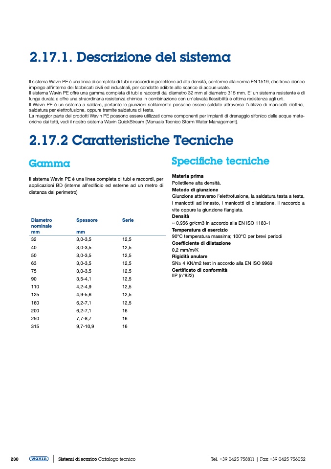 Il sistema Wavin PE è una linea di completa di tubi e raccordi in polietilene ad alta densità, conforme alla norma EN 1519, che trova idoneo