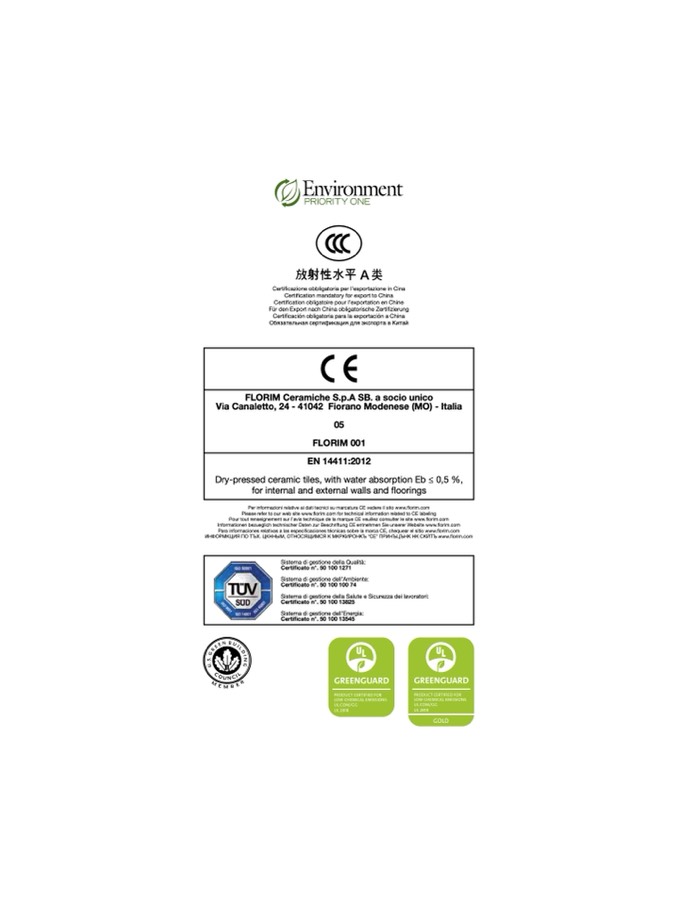 Para informaciones relativas a las especificaciones técnicas sobre la marca CE, chequear el sitio www.florim.com