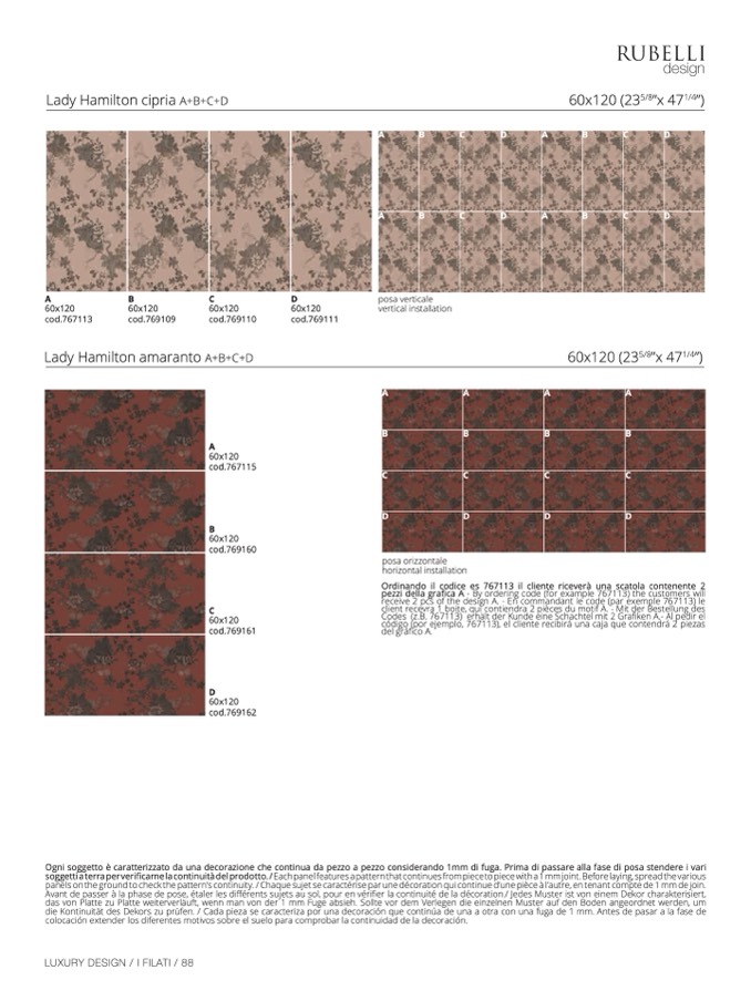 the ground to check the pattern’s continuity. / Chaque sujet se caractérise par une décoration qui continue d’une pièce à l’autre, en tenant compte de 1 mm de join.