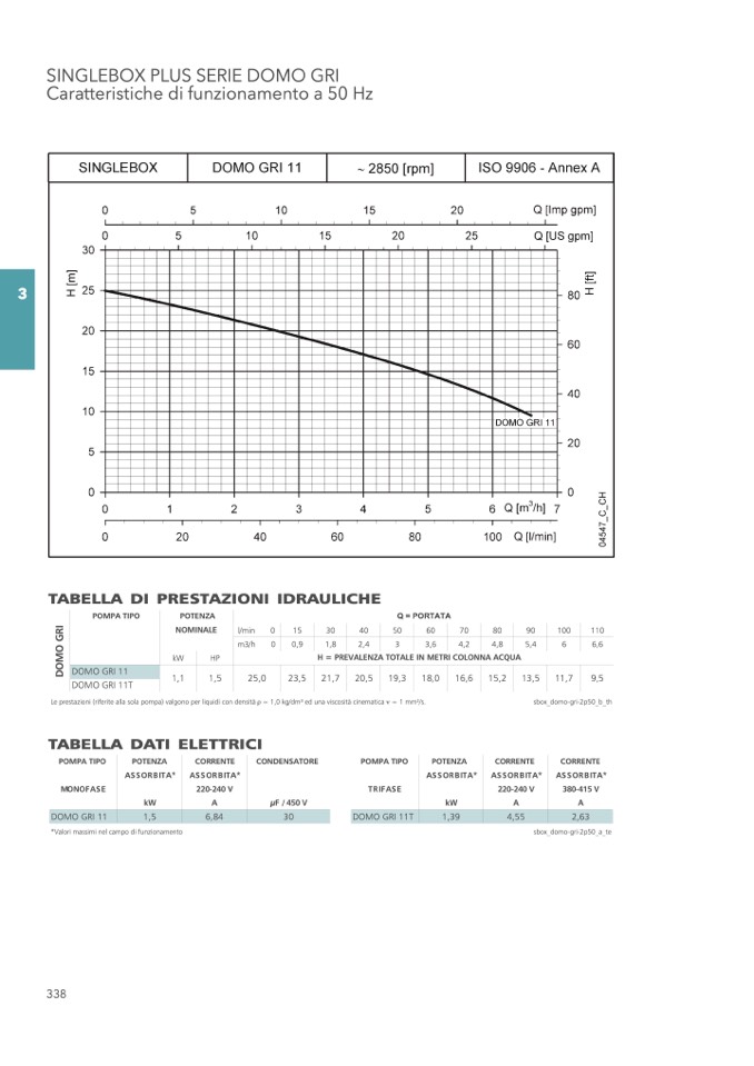 Le prestazioni (riferite alla sola pompa) valgono per liquidi con densità = 1,0 kg/dm3 ed una viscosità cinematica = 1 mm2/s.