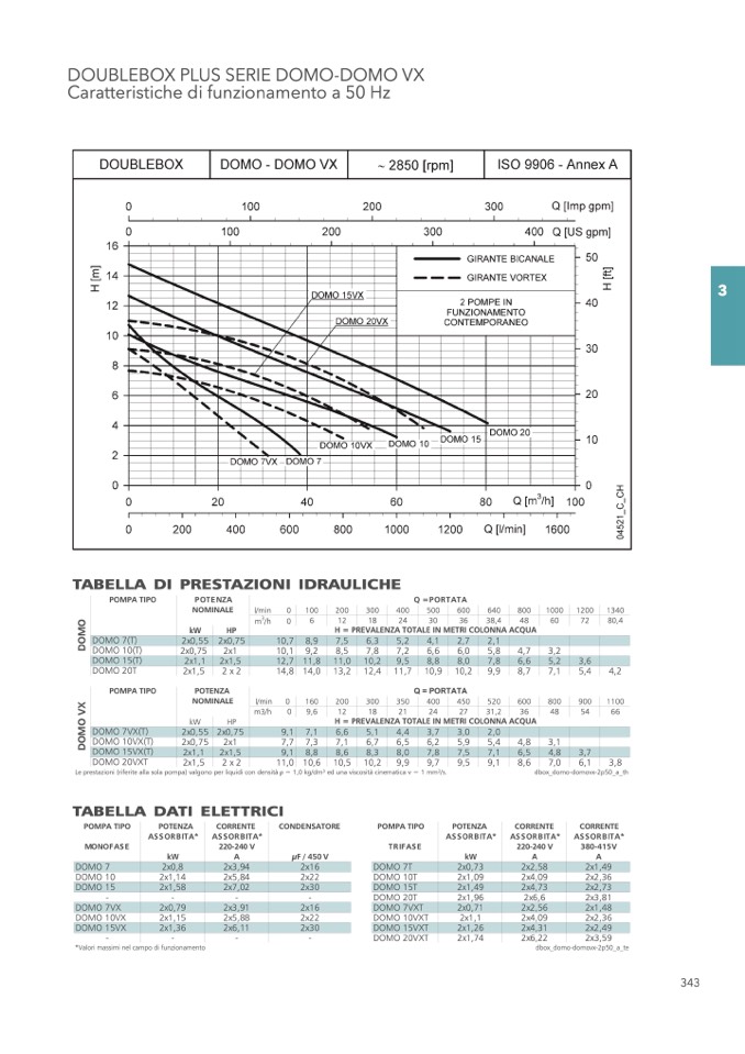 Le prestazioni (riferite alla sola pompa) valgono per liquidi con densità = 1,0 kg/dm3 ed una viscosità cinematica = 1 mm2/s.