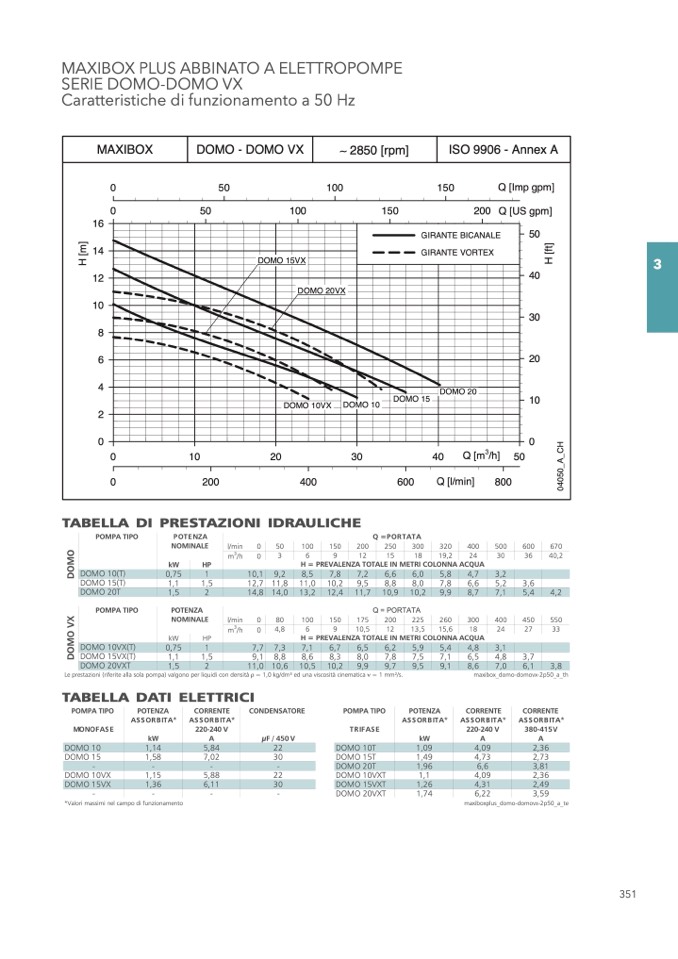 Le prestazioni (riferite alla sola pompa) valgono per liquidi con densità = 1,0 kg/dm3 ed una viscosità cinematica = 1 mm2/s.