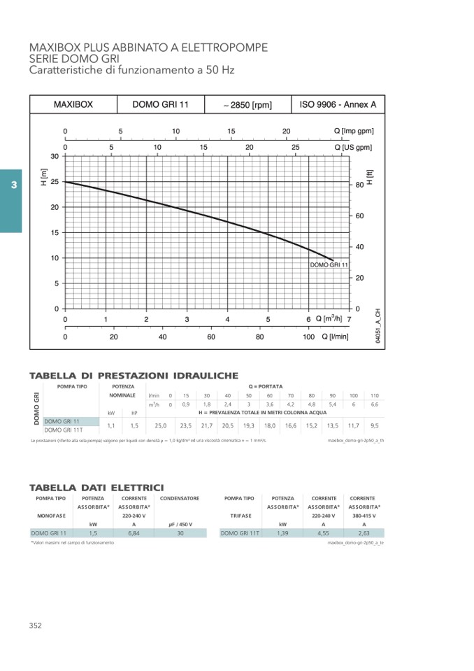 Le prestazioni (riferite alla sola pompa) valgono per liquidi con densità = 1,0 kg/dm3 ed una viscosità cinematica = 1 mm2/s.