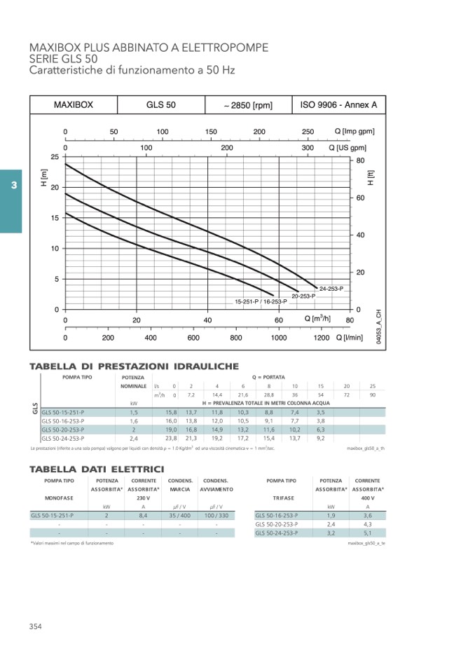 Le prestazioni (riferite a una sola pompa) valgono per liquidi con densità = 1.0 Kg/dm