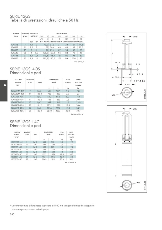 * Le elettropompe di lunghezza superiore ai 1500 mm vengono fornite disaccoppiate.