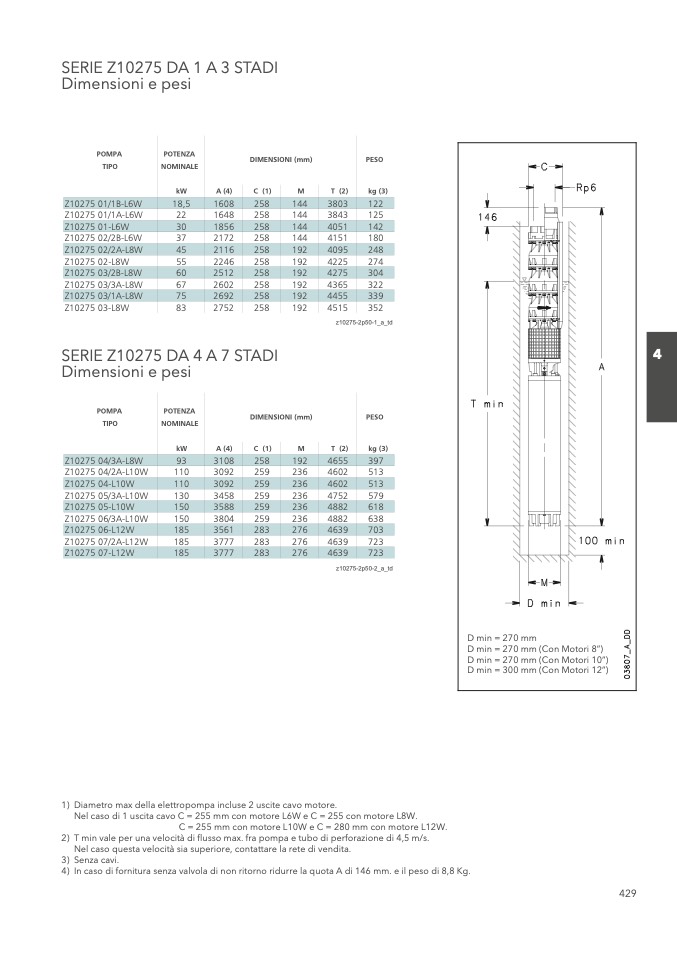 4) In caso di fornitura senza valvola di non ritorno ridurre la quota A di 146 mm. e il peso di 8,8 Kg.