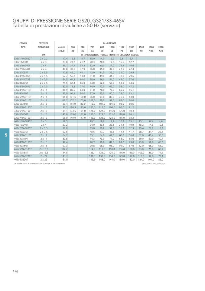 La tabella indica le prestazioni con 2 pompe in funzionamento