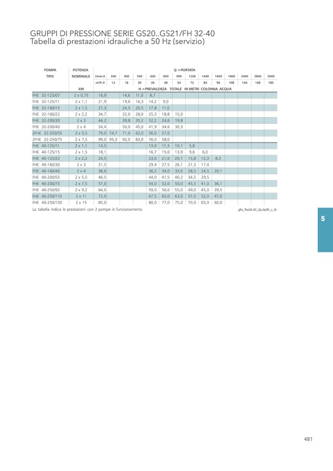 La tabella indica le prestazioni con 2 pompe in funzionamento