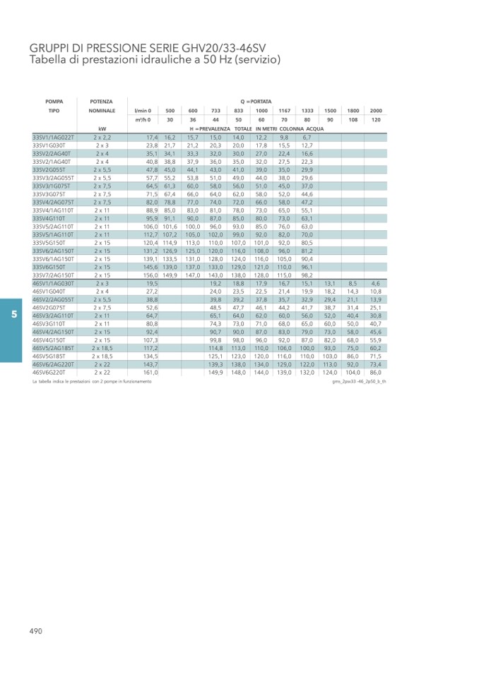 La tabella indica le prestazioni con 2 pompe in funzionamento