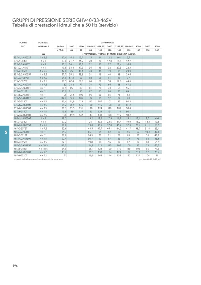 La tabella indica le prestazioni con 4 pompe in funzionamento