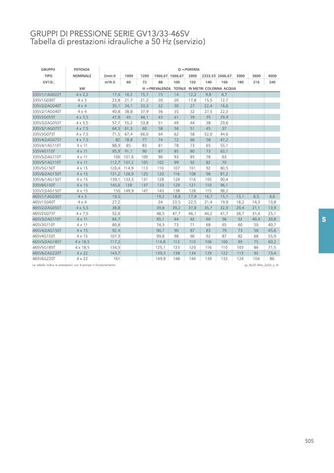 La tabella indica le prestazioni con 4 pompe in funzionamento