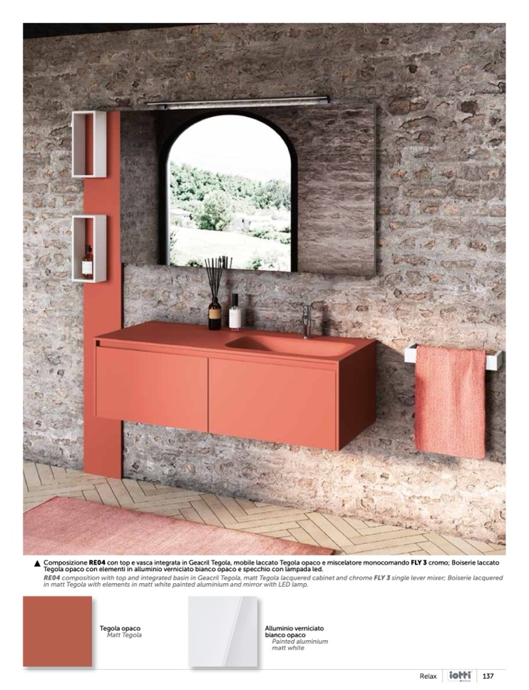 Composizione RE04 con top e vasca integrata in Geacril Tegola, mobile laccato Tegola opaco e miscelatore monocomando FLY 3 cromo; Boiserie laccato