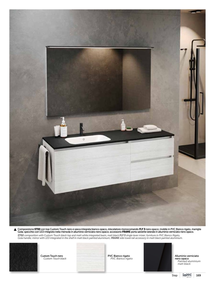 ST02 composition with Custom Touch black top and matt white integrated basin, matt black FLY 3 single lever mixer; furniture in PVC Bianco Rigato,