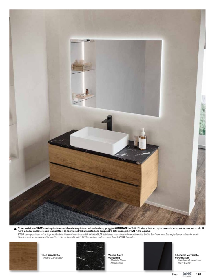 nero opaco; mobile Noce Canaletto ; specchio retroilluminato LED su quattro lati; maniglia FILO nero opaco.