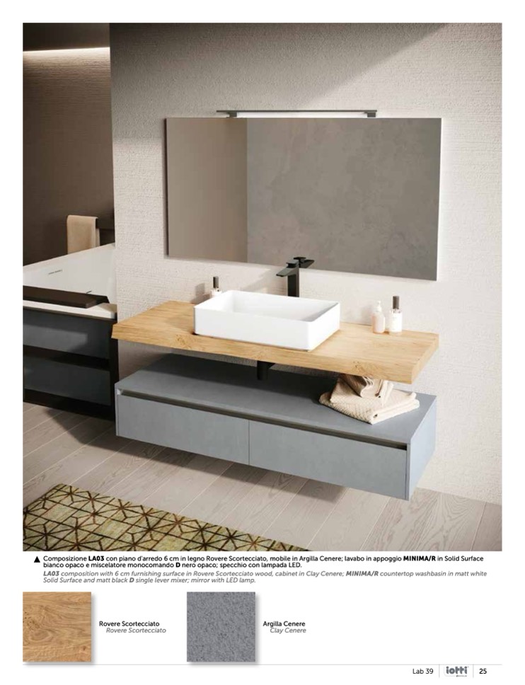 LA03 composition with 6 cm furnishing surface in Rovere Scortecciato wood, cabinet in Clay Cenere; MINIMA/R countertop washbasin in matt white