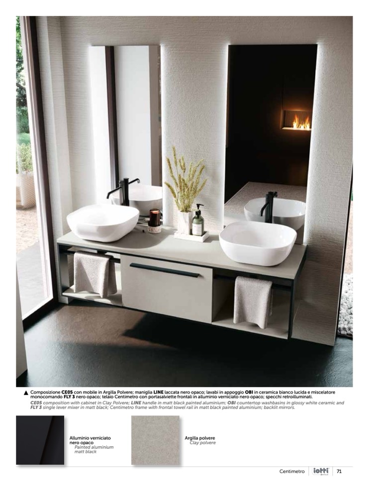 CE05 composition with cabinet in Clay Polvere; LINE handle in matt black painted aluminium; OBI countertop washbasins in glossy white ceramic and