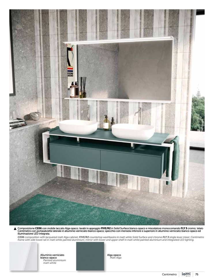 CE06 composition with lacquered matt Alga cabinet; FIVE/R2 countertop washbasins in matt white Solid Surface and chrome FLY 3 single lever mixer; Centimetro