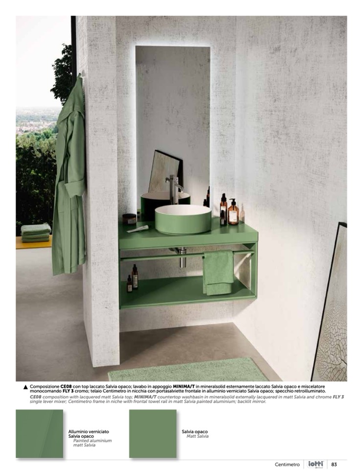 single lever mixer; Centimetro frame in niche with frontal towel rail in matt Salvia painted aluminium; backlit mirror.