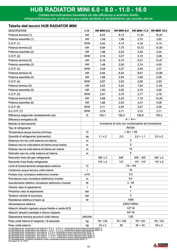 (1) Riscaldamento: temperatura aria esterna 7 °C b.s. - 6 °C b.u.; temperatura acqua ingresso/uscita 30/35 °C