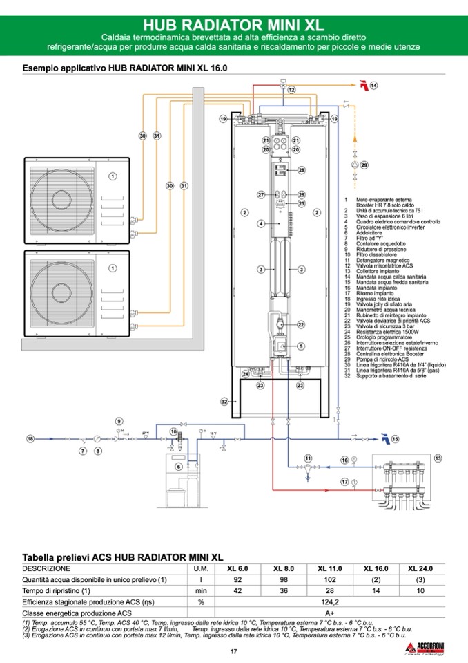 (1) Temp. accumulo 55 °C, Temp. ACS 40 °C, Temp. ingresso dalla rete idrica 10 °C, Temperatura esterna 7 °C b.s. - 6 °C b.u.