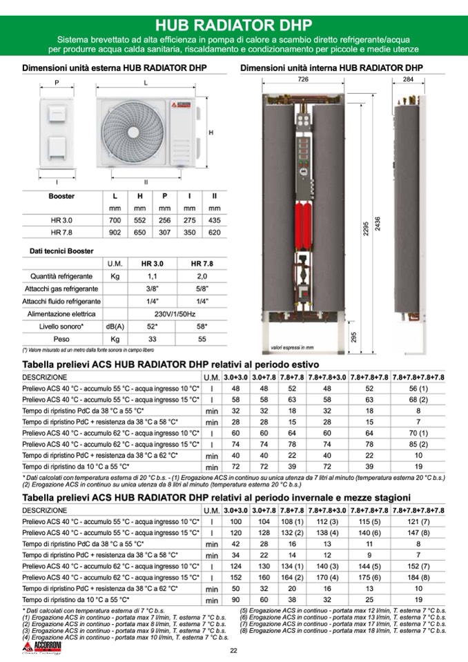 * Dati calcolati con temperatura esterna di 20 °C b.s. - (1) Erogazione ACS in continuo su unica utenza da 7 litri al minuto (temperatura esterna 20 °C b.s.)