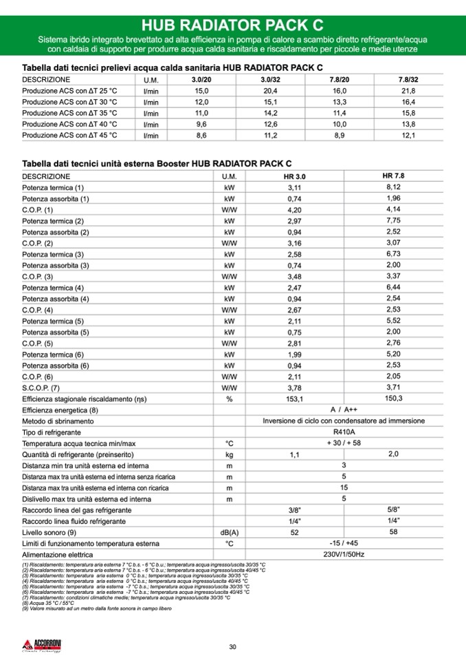 (1) Riscaldamento: temperatura aria esterna 7 °C b.s. - 6 °C b.u.; temperatura acqua ingresso/uscita 30/35 °C