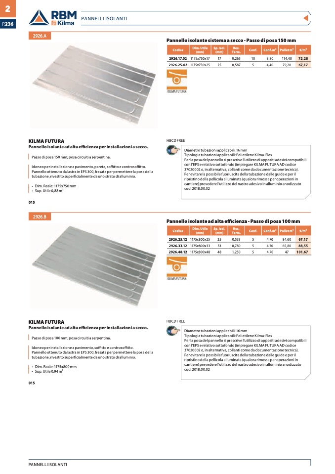 Passo di posa 150 mm; posa circuiti a serpentina.