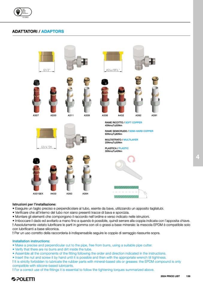 ! For a correct use of the fittings it is essential to follow the tightening torques summarized above.