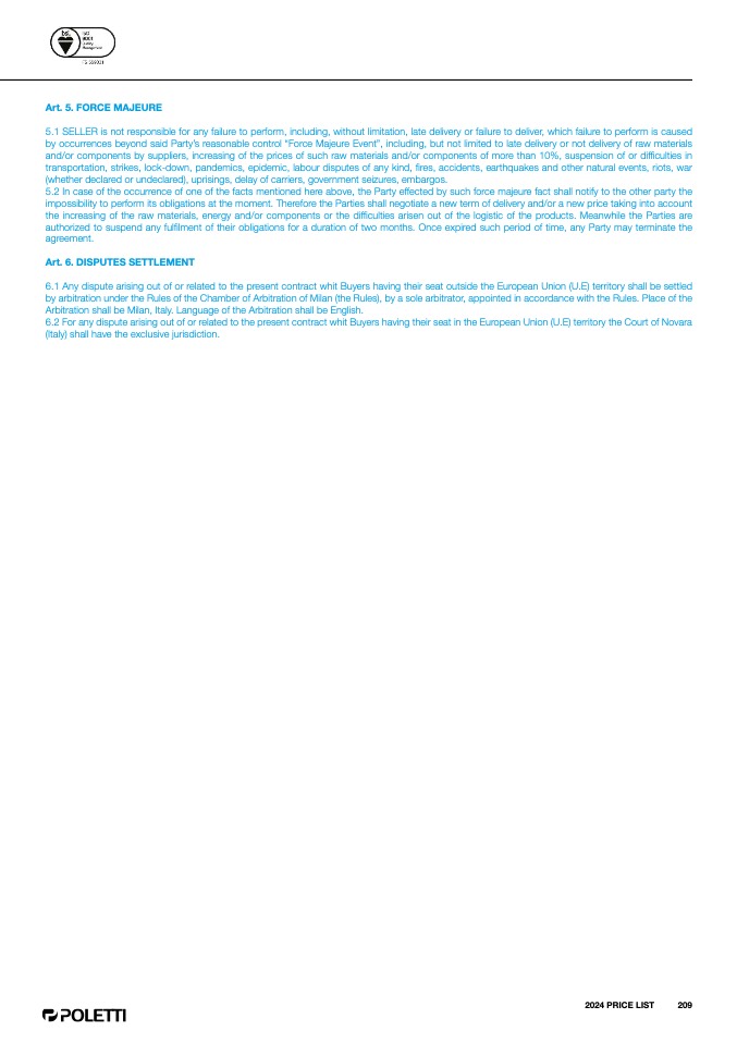 6.1 Any dispute arising out of or related to the present contract whit Buyers having their seat outside the European Union (U.E) territory shall be settled