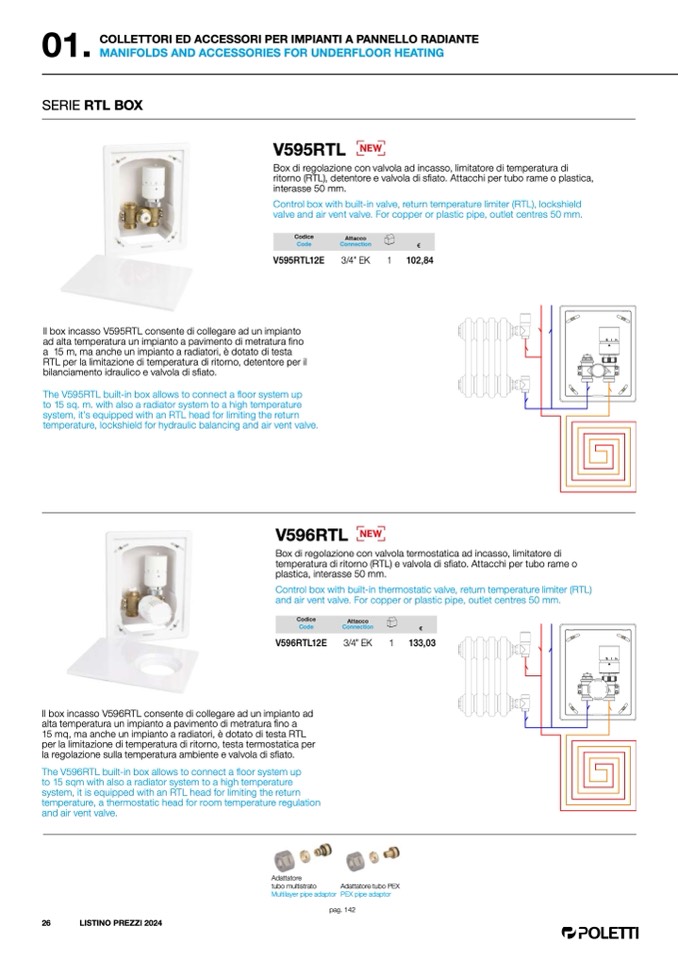ritorno (RTL), detentore e valvola di sfiato. Attacchi per tubo rame o plastica,