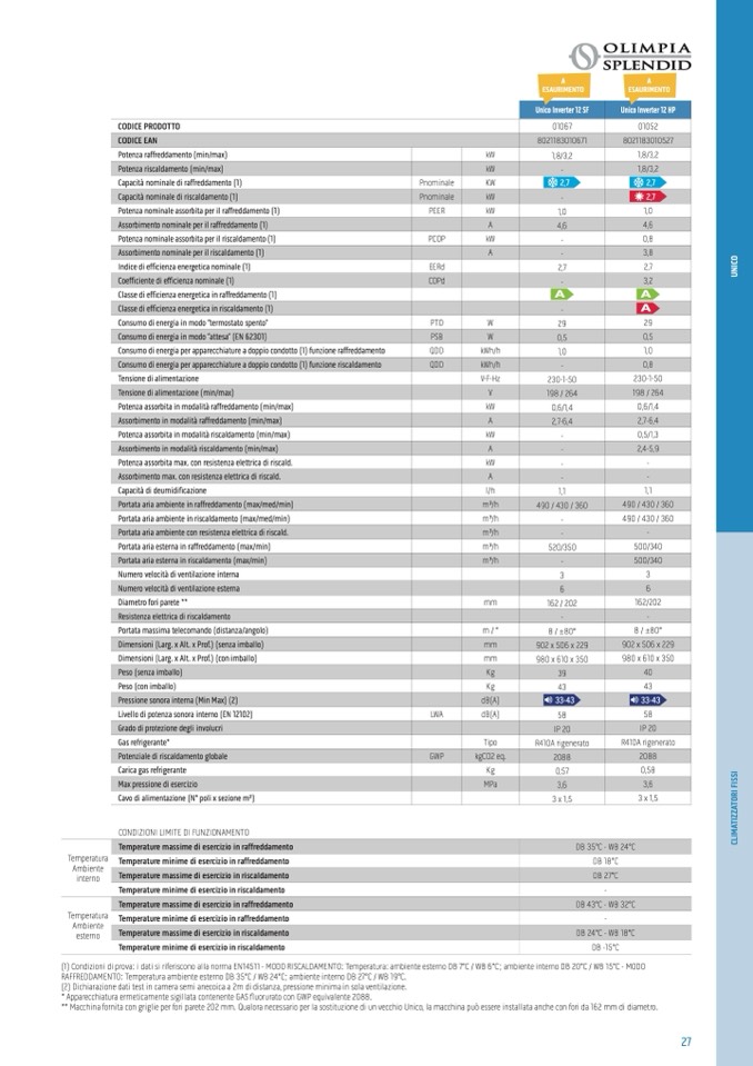 (1) Condizioni di prova: i dati si riferiscono alla norma EN14511 - MODO RISCALDAMENTO: Temperatura: ambiente esterno DB 7°C / WB 6°C; ambiente interno DB 20°C / WB 15°C - MODO