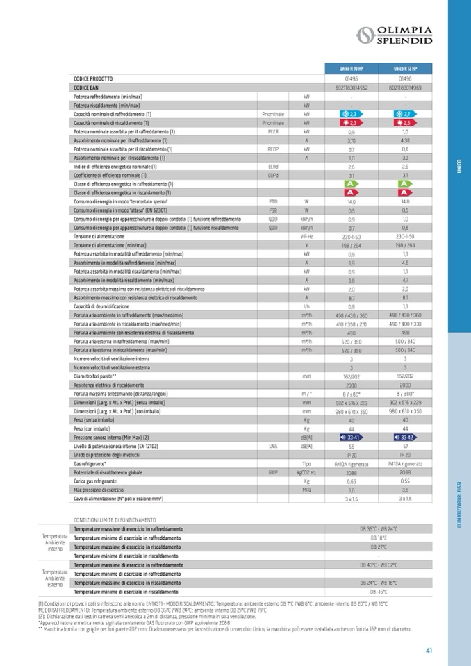 (1) Condizioni di prova: i dati si riferiscono alla norma EN14511 - MODO RISCALDAMENTO: Temperatura: ambiente esterno DB 7°C / WB 6°C; ambiente interno DB 20°C / WB 15°C