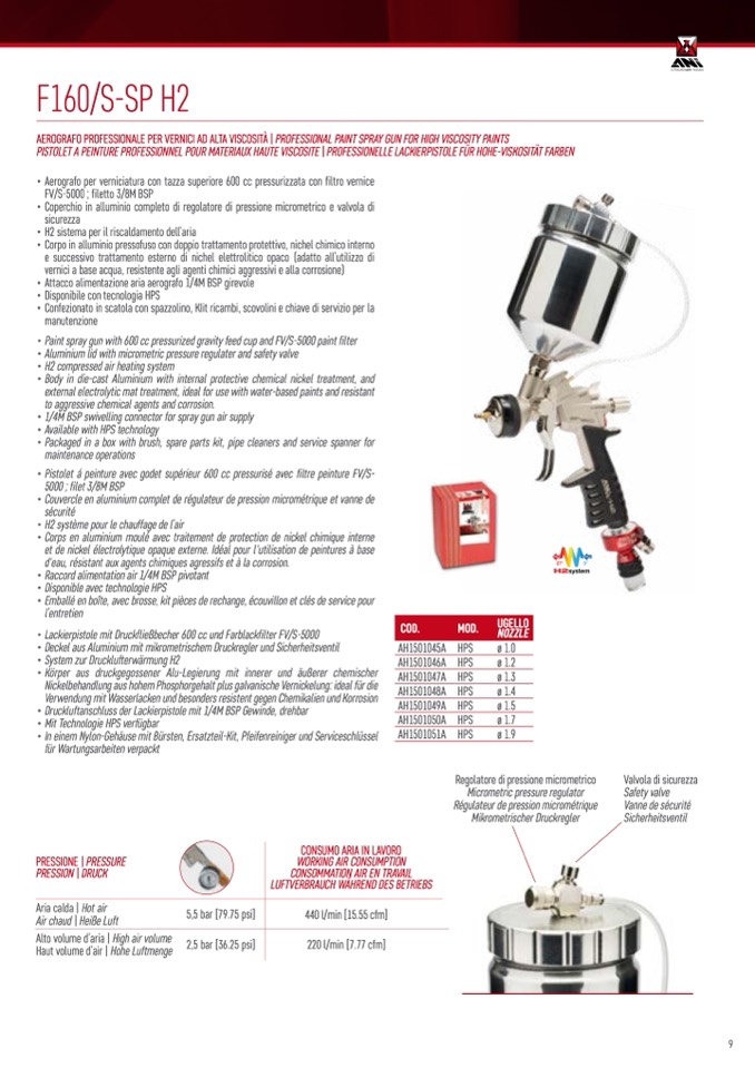• Paint spray gun with 600 cc pressurized gravity feed cup and FV/S-5000 paint filter