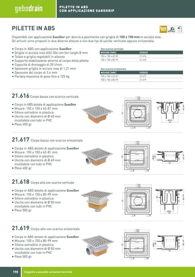 Disponibili con applicazione SandGrip per doccia a pavimento con griglia di 150 x 150 mm in acciaio inox.