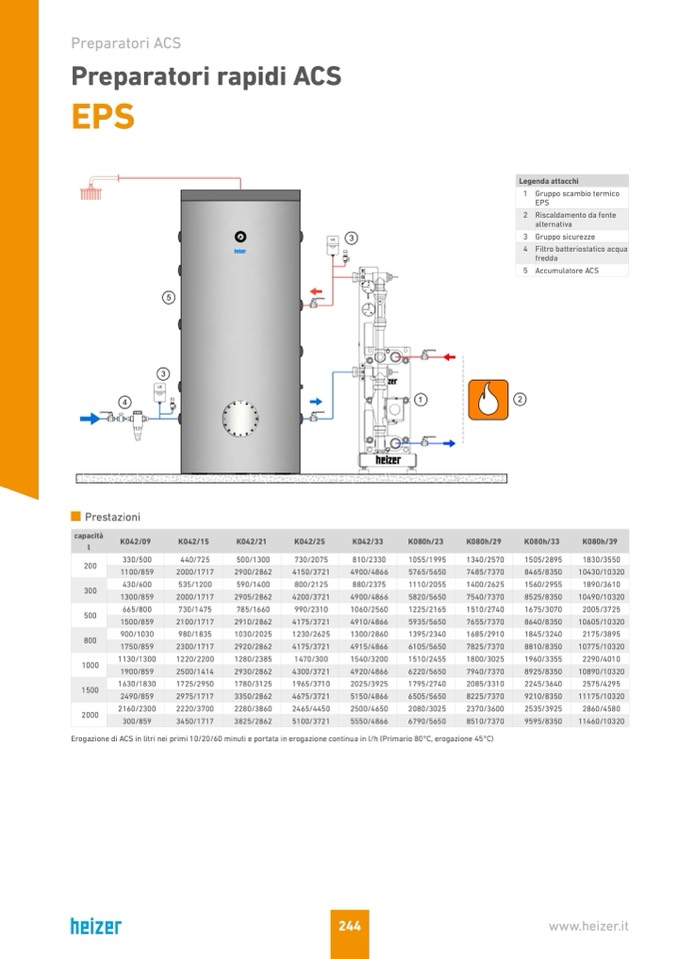 Erogazione di ACS in litri nei primi 10/20/60 minuti e portata in erogazione continua in l/h (Primario 80°C, erogazione 45°C)