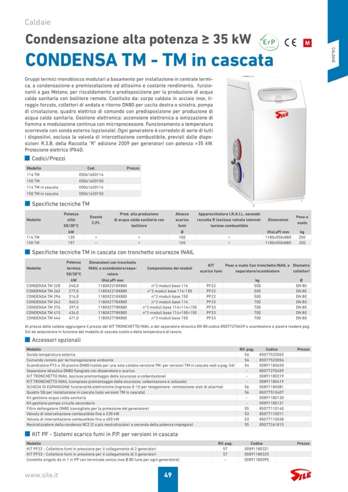 Al prezzo delle caldaie aggiungere il prezzo del KIT TRONCHETTO INAIL e del separatore idraulico DN 80 codice 85077270459 o scambiatore a piastre (vedere pag.
