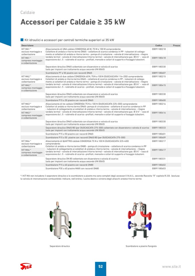 * I KIT MA non includono il separatore idraulico o lo scambiatore a piastre ma sono completi degli accessori I.N.A.I.L. secondo Raccolta “R” capitolo R.3.B. (esclusa