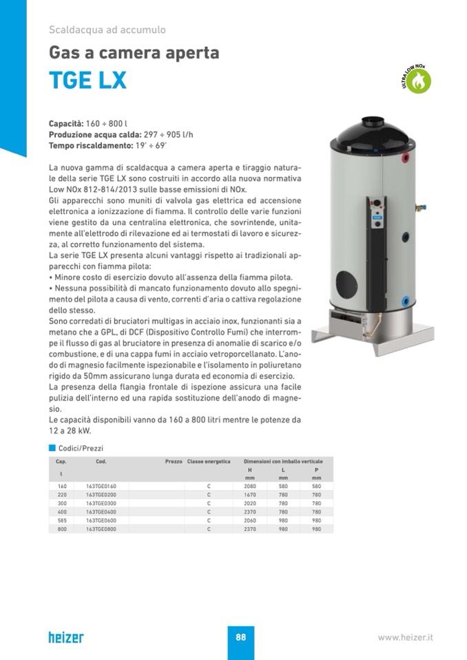 Le capacità disponibili vanno da 160 a 800 litri mentre le potenze da