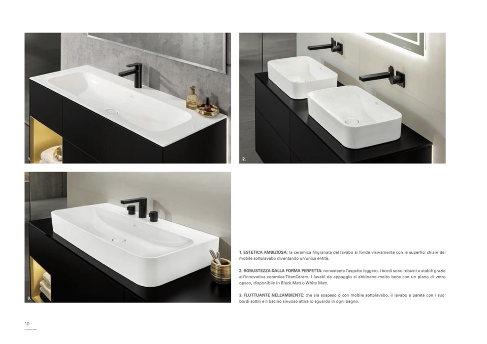1. ESTETICA AMBIZIOSA: la ceramica filigranata del lavabo si fonde visivamente con le superfici chiare del